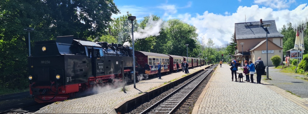 Die Harzer Schmalspurbahnen GmbH (HSB) ist eine Eisenbahngesellschaft im Harz. Ihre Strecken sind hauptsächlich dampfbetrieben und gelten als eine überregionale Touristenattraktion. Das meterspurige Streckennetz erstreckt sich über eine Länge von 140,4 km und ist ganzjährig in Betrieb. Deshalb nennt sich die HSB „Die Größte unter den Kleinen“. Das Netz besteht aus den drei Einzelstrecken Harzquer-, Selketal- und Brockenbahn. Die Anfangsbuchstaben dieser Strecken ergeben HSB, was dem abgekürzten Namen des Unternehmens entspricht. Dann ging es endlich zur Harzer Schmalspurbahn mit einer Fahrt auf den Brocken. Steigen Sie ein und erleben Sie eine unvergessliche Fahrt mit der historischen Brockenbahn! Entdecken Sie den sagenumwobenen Brocken, der mit 1.141 Metern der höchste Gipfel Norddeutschlands ist.Die Strecke durch den Nationalpark Harz bietet ein beeindruckendes Panorama, während Sie in nostalgischem Ambiente die romantische Kraft unserer Dampflokomotiven genießen. Seit 1992 dampfen unsere mächtigen Lokomotiven, mit einer beeindruckenden Leistung von rund 700 PS, mehrmals täglich hinauf - zum legendären Brocken. Ohne Zahnräder – allein durch die Kraft purer Adhäsion – überwinden unsere Züge das steilste Streckenstück ab dem Bahnhof Drei-Annen-Hohne in nur etwa 50 Minuten. Lassen Sie sich von der Magie der Brockenbahn verzaubern – ein Erlebnis, das Geschichte und Natur auf unvergessliche Weise verbindet. Panoramablicke und Natur pur: Genießen Sie die spektakulären Ausblicke auf den Nationalpark Harz.