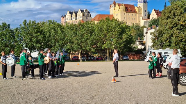 Spielmannszug junger Musiker begrüßt, die zu einer Probe angetreten